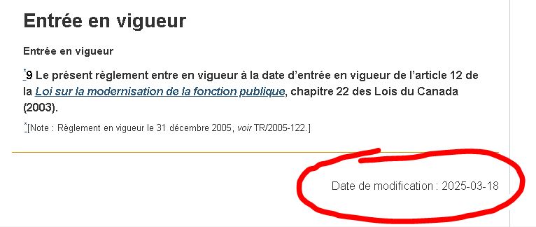 Un rapide coup d’œil sur le site internet du gouvernement concernant le “Règlement sur les Langues Officielles — Nominations dans la Fonction Publique – DORS/2005-347” de la “Loi sur L’Emploi dans la Fonction Publique” on est en droit de se demander ce qui a bien pu être modifié sur cette page internet le 18 mars 2025?